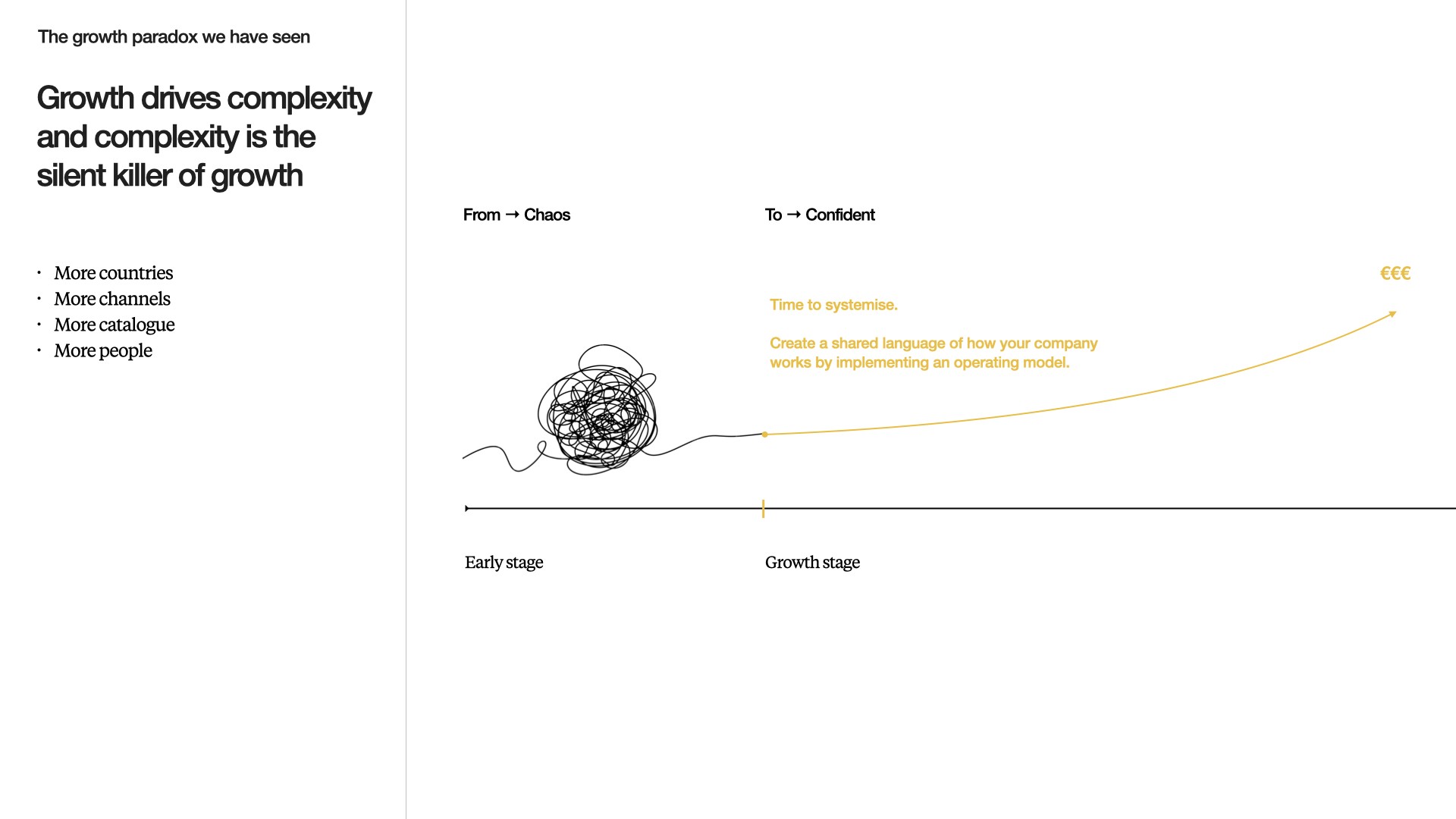 It usually happens somewhere between €20 million and €200 million in revenue. The company is no longer a start-up, but it isn’t yet a machine. There are more countries. More channels. More SKUs. More people. More dashboards. More tools. More meetings.