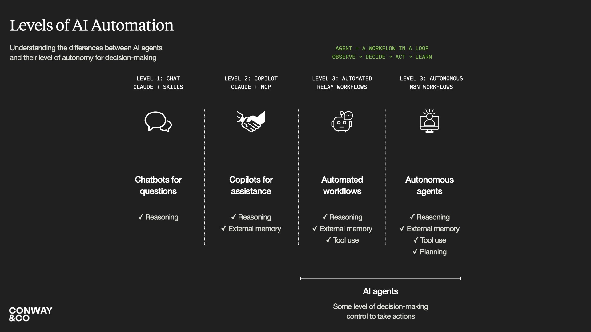 An AI agent is not magic. It is, at its core, a workflow in a loop: observe, decide, act, learn . It can take instructions, use tools, access memory, and execute tasks across systems. It becomes a digital worker.